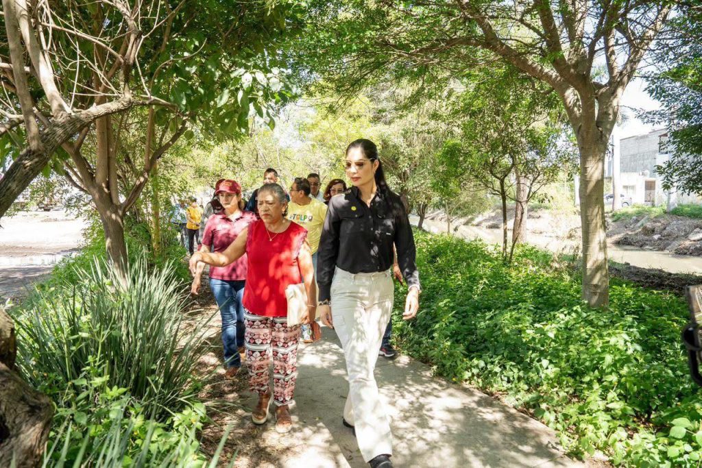 * La alcaldesa de Tepic dirige los trabajos en la calle Luis Pasteur, que incluyen empedrado ahogado, banquetas y rescate de áreas verdes.