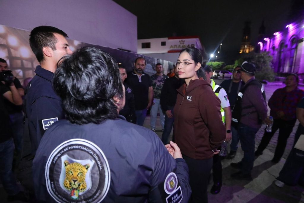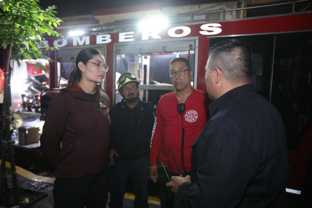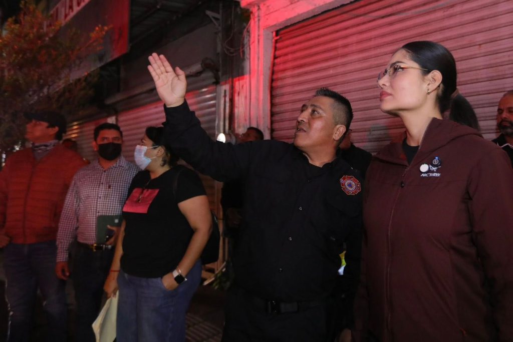 Tepic.- La presidenta municipal de Tepic, Geraldine Ponce, acudió esta madrugada al mercado Juan Escutia para dialogar con las y los locatarios afectados por el incendio ocurrido durante la noche del martes.